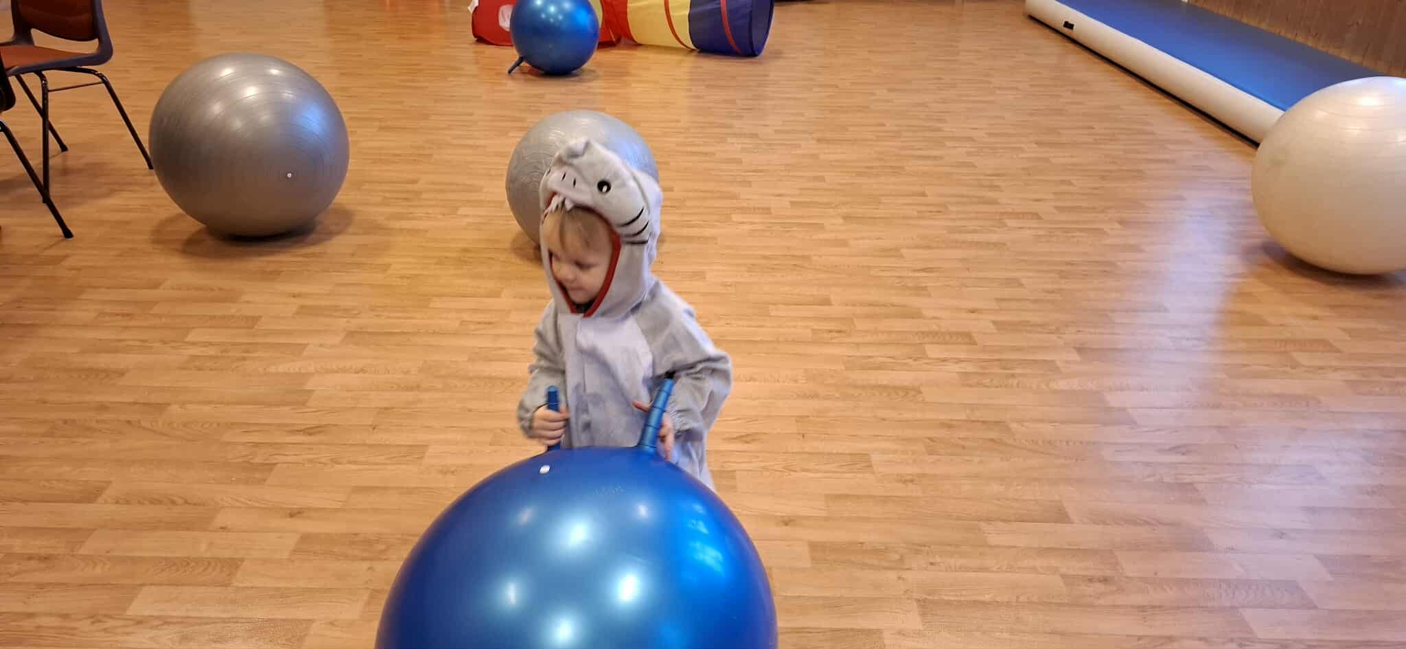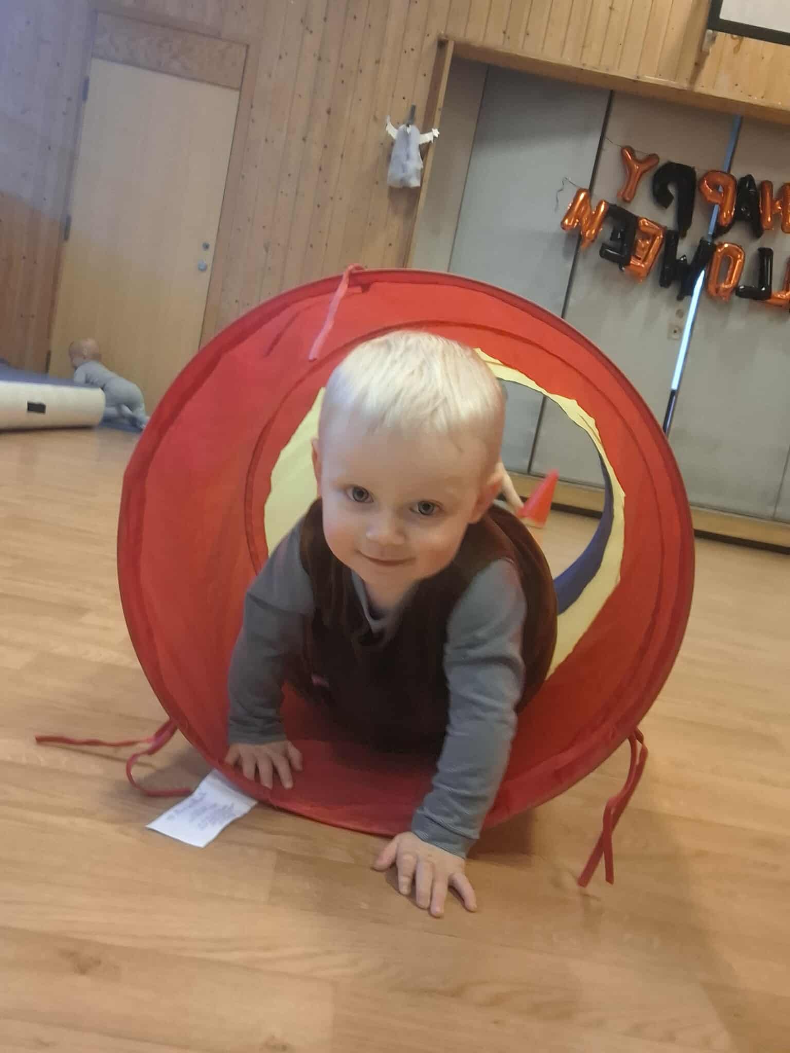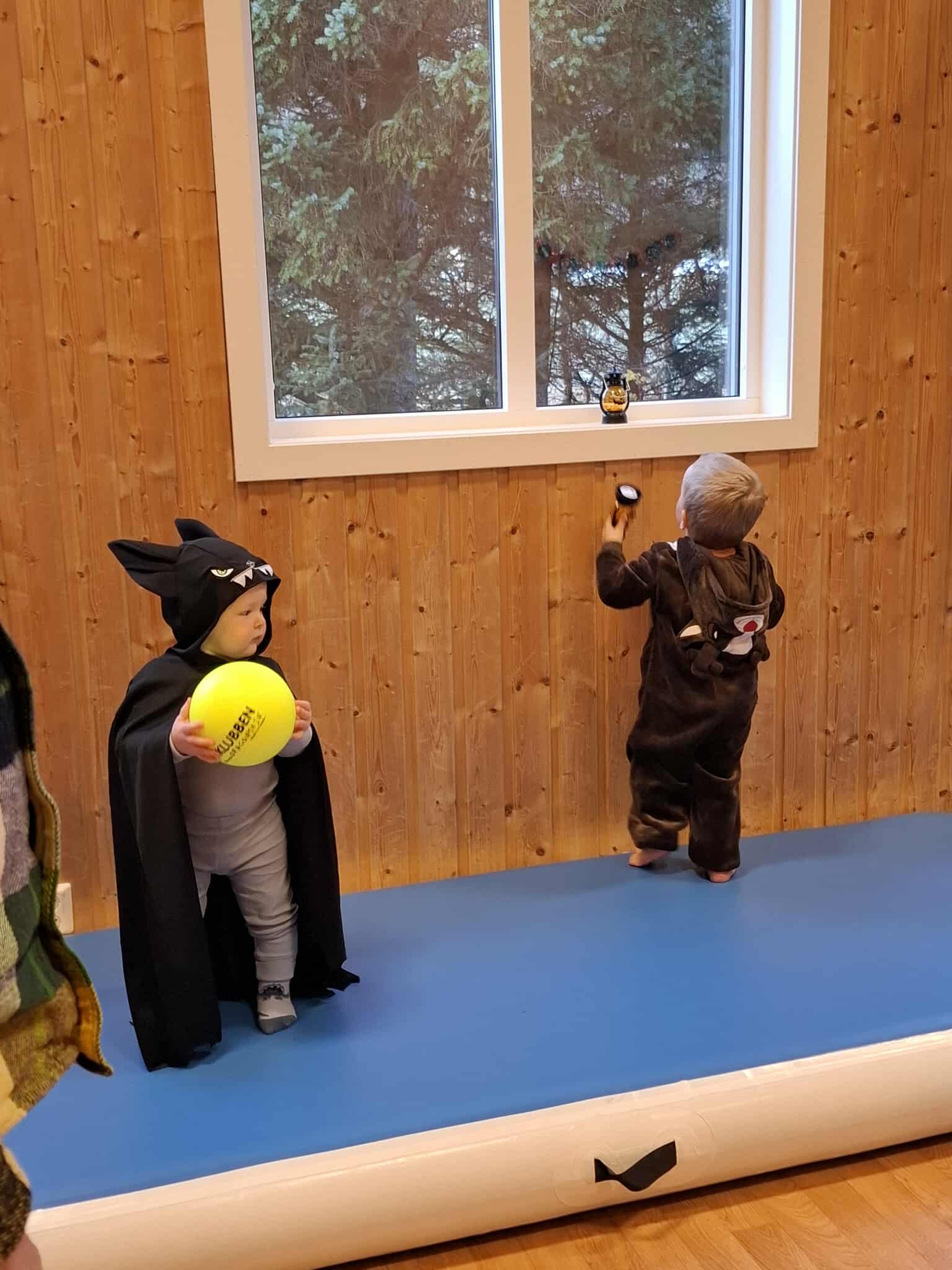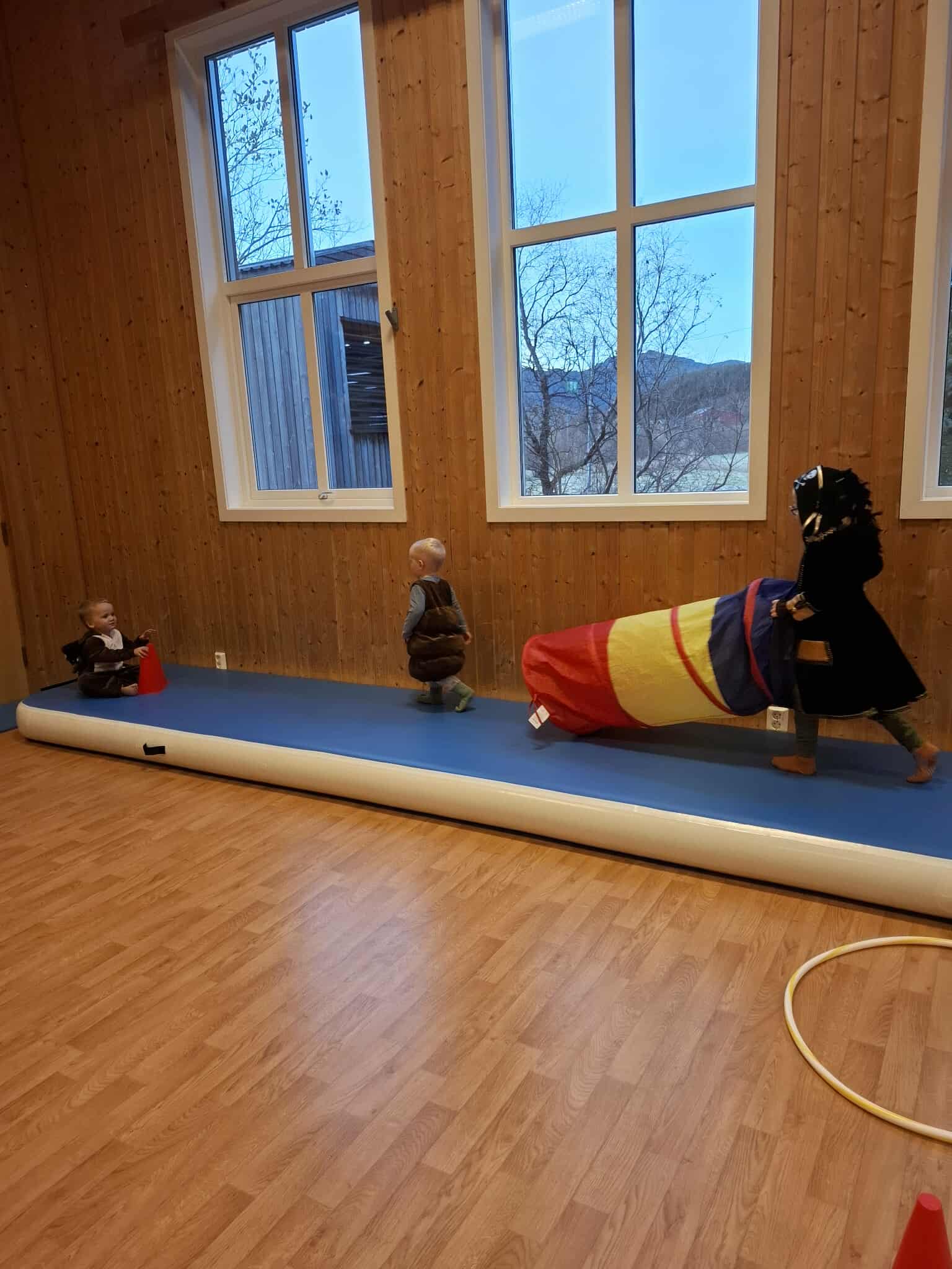 Langs den ene veggen var det rigget til et imponerende turnlandskap, deriblant: to tjukkas-madrasser, en seks meter lang AirTrack, trampett, turnbukker, rør til å krype gjennom m.m. Alt som trengs for å utfordre balansenerven, kondisjonen, høydeskrekken (og skjebnen for øvrig). Forholdene lå til rette for maksimalt aktivitetsnivå og minimal friksjon i forbindelse med leggetid senere på kvelden.